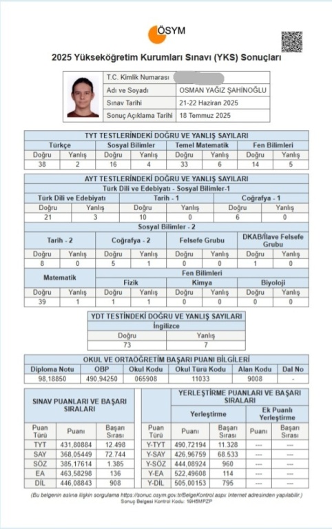 TÜRKİYE 114.CÜSÜ OLAN ÖĞRENCİMİZ